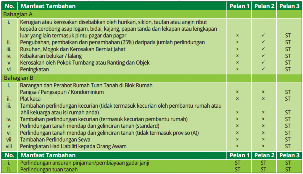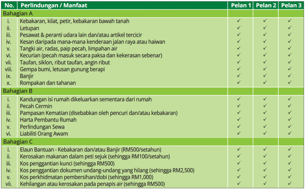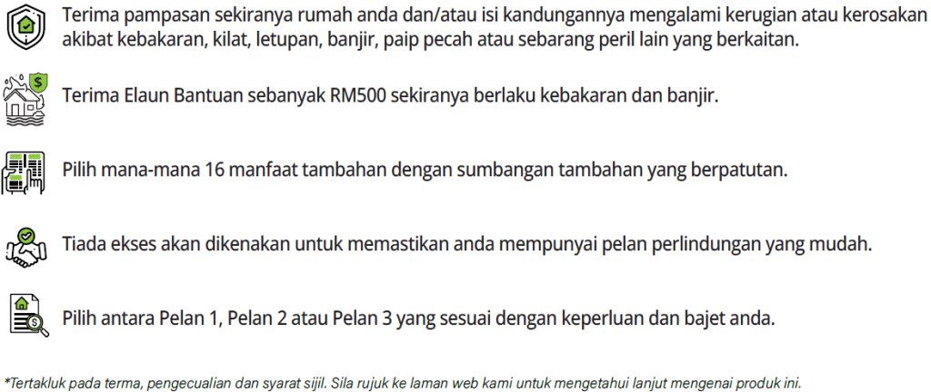 Polisi ini melindungi rumah dan/atau isi kandungan rumah akibat kerugian atau kerosakan yang berpunca dari kebakaran, kilat, letupan domestik, pecahan /limpahan tangki air atau paip, angin ribut dan banjir.